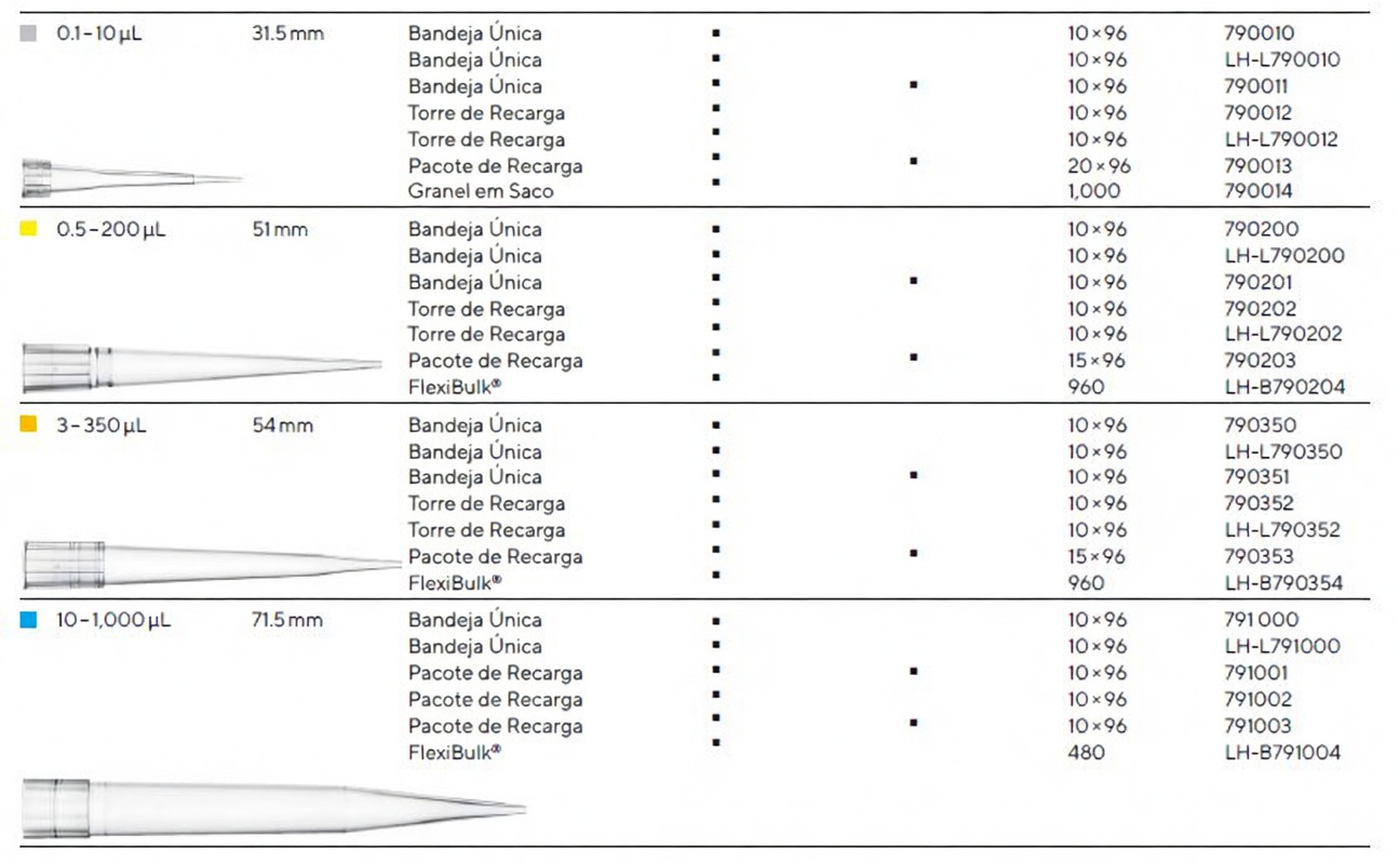 | 0.5–200 µL | 51 mm | Single Tray | Sim | Alta pureza | Sim | 10 × 96 | 790200 |