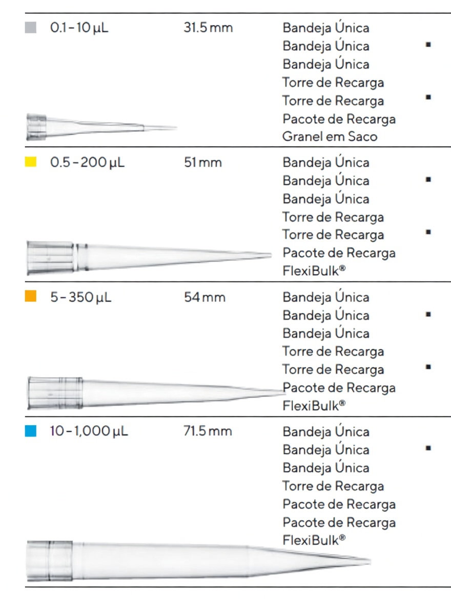 | Volume | Comprimento | Embalagem | Baixa Retenção | Pureza | Esterilizado | Unidades | Código |